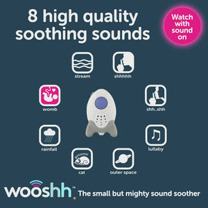 Wooshh can help, by surrounding your baby with soothing and familiar sounds. Created by sound engineer Dr. Nick Webb, Wooshh is USB rechargeable and features a high-quality speaker that delivers clear and soothing sounds in a compact size. It includes 8 calming options such as various mother's "shhh" sounds, purring cat, mother's womb, rainfall, stream, lullaby, and space sound (Courtsey of NASA).